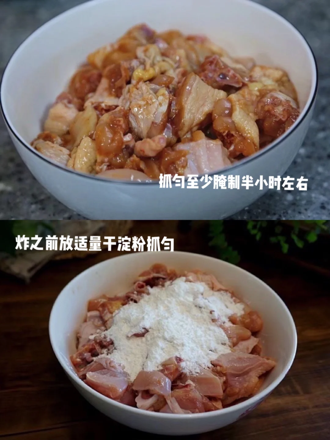 6.炸鸡块之前放入适量干淀粉 让鸡肉块挂浆