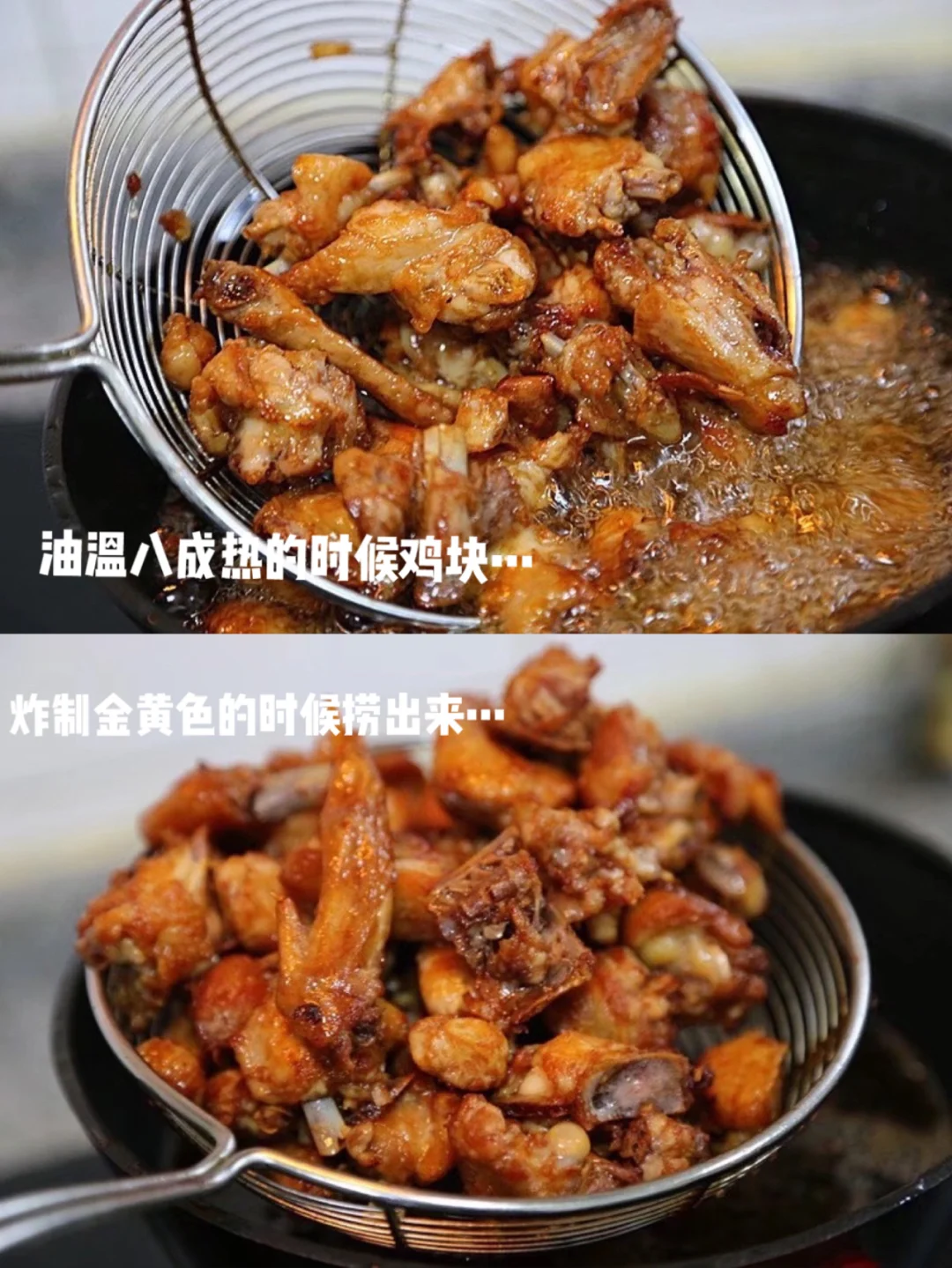 11.慢慢炸至金黄色的时候捞出来 再一次油烧热倒入鸡块,复炸一次 沥干油捞出来待用