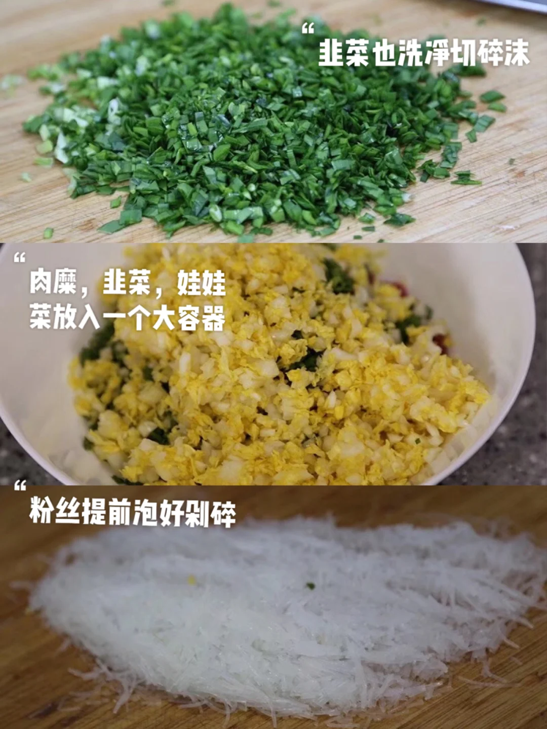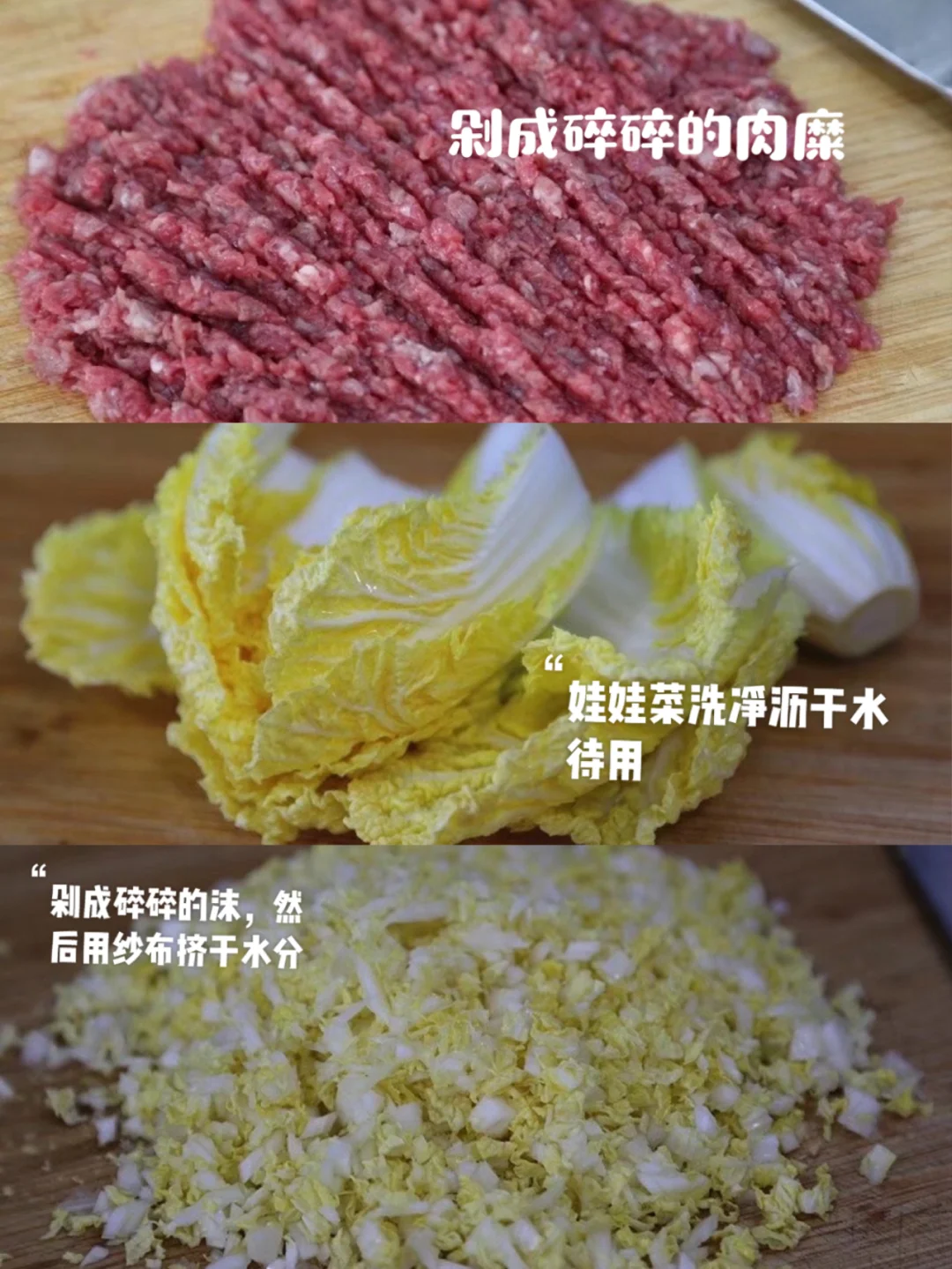 6.其他的蔬菜配菜可以根据自己的喜好来更换 但是要记住的是容易出水的蔬菜最好开水里焯下水,挤干切细碎 今天用的是娃娃菜,洗净