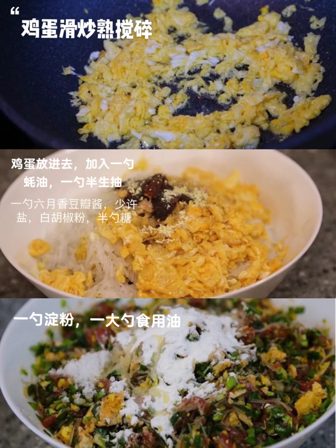 11.鸡蛋锅里炒熟划小碎,不行就后面刀剁一下即可12.鸡蛋也放入到碗里,一勺耗油,少许生抽,一勺六月香豆瓣酱 少许盐,白胡椒粉,半勺糖