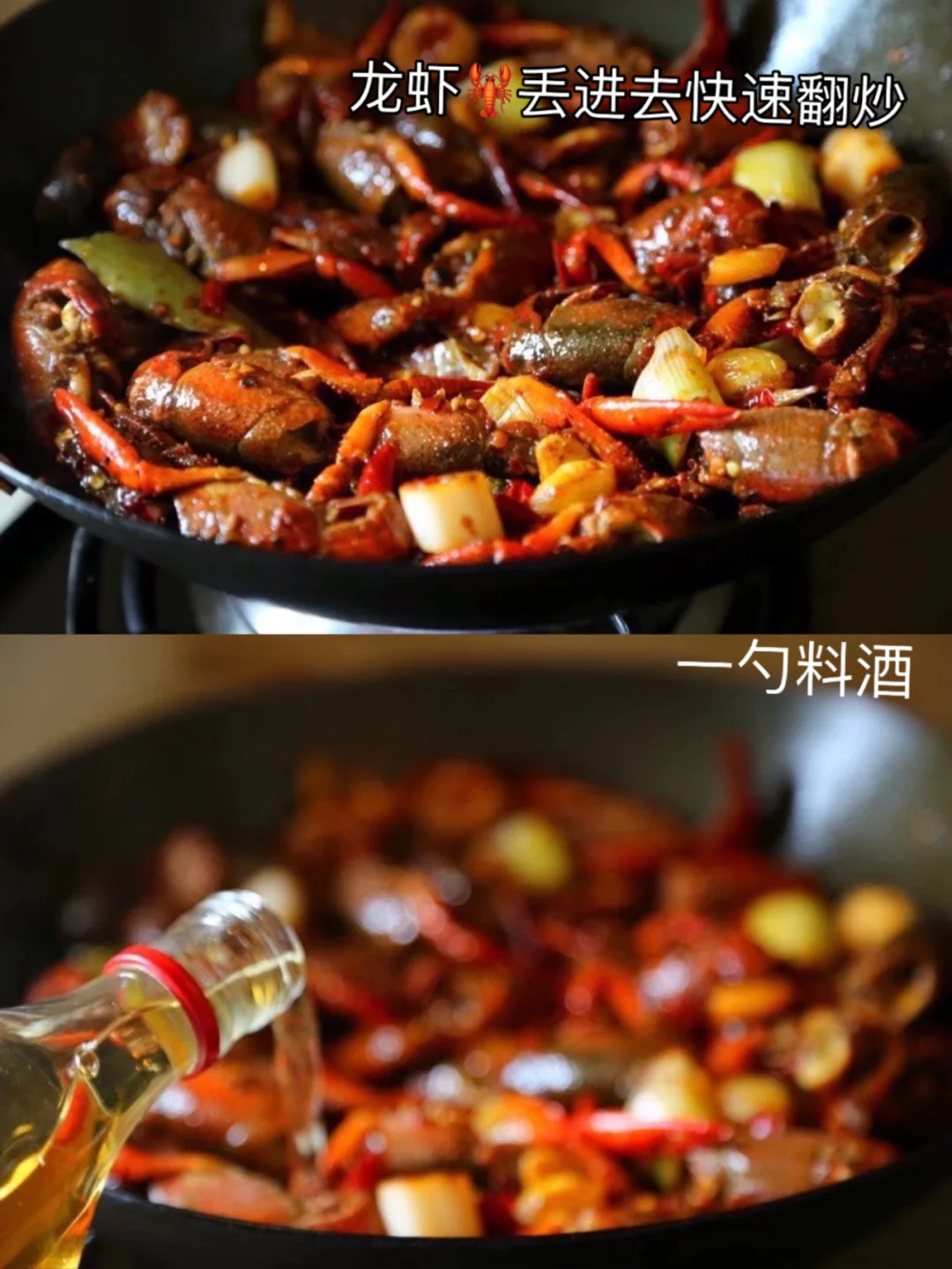 12.小龙虾沥干水放进去,转大火快速翻炒,直到变成红色