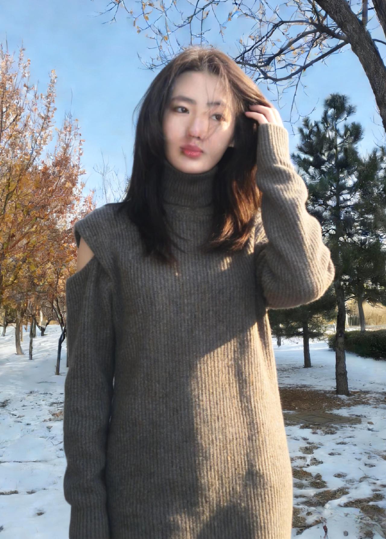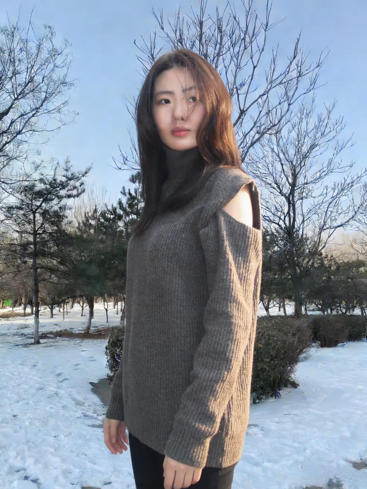 晓日初升照雪垠,寒林疏影立佳人。 针织裁就灰罗袂,露肩斜分玉屑尘。 鬓发轻扬承晓风,眸光远送逐晴云。 独行未觉冬深冷,心有温阳自暖身。