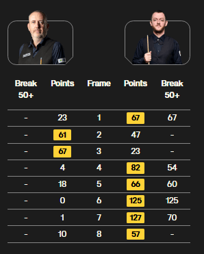 全场比赛,艾伦打出一杆破百(125)和四杆50+(67、54、60、70)。威廉姆斯没有打出一杆50+。