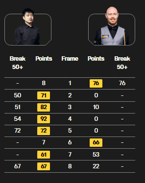 全场比赛,赵心童5杆50+(50、51、54、72、67),加里-威尔逊仅打出一杆50+(76)。