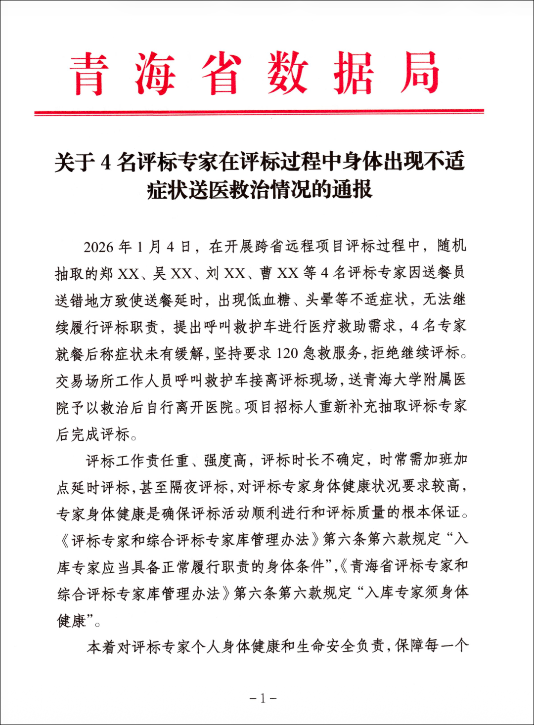 近日,青海省数据局在青海省公共资源交易网发布《关于4名评标专家在评标过程中身体出现不适症状送医救治情况的通报》。