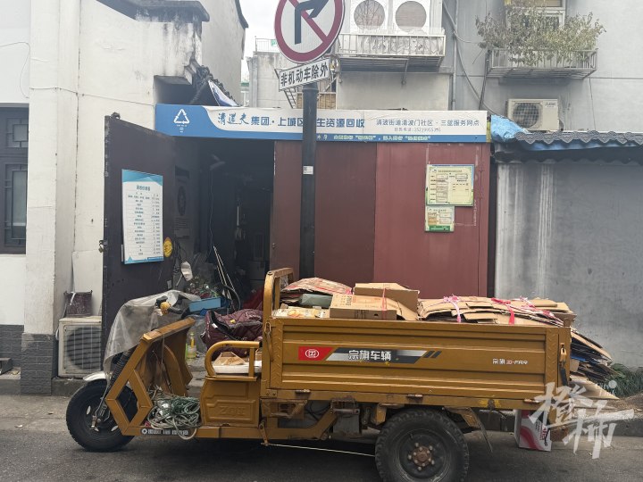 站点负责人张先生正在三轮车前分类收置杂物,张先生说,老小区的住户家中有很多废旧物品,比如废家电、废电脑、旧衣服等,大家就近拿过来就可以回收,“我归类好以后会统一运去集置”。