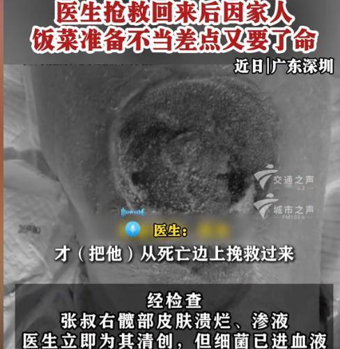 “命真大啊!”近日,广东深圳,一男子因腰腿痛便在家自行拔火罐,本想用来驱驱寒缓解疼痛,可是竟操作不当导致皮肤溃烂渗液,一度休克住进进ICU,没想到刚被救回又因家人未按医嘱备餐误将食物吸进气管险些丧命。网友:险象环生! 拔火罐是传统中医理疗方式,能通过罐内负压吸附皮肤达到疏通经络、散寒除湿、缓解肌肉劳损的效果,正因如此,它成了很多人日常养生、缓解身体酸痛的选择。但非专业人士自行操作极易引发健康事故。 据媒体1月10日报道,张先生患有糖尿病多年,一直没有经过系统治疗,平常腰腿疼痛也只是在家拔拔火罐,这天他像往常一样在家自行操作拔火罐,没想到操作不当直接导致皮肤出现溃烂、渗液的情况,他起初以为只是简单烫伤,没什么事,于是并未及时就医,只是涂了点药膏。直到症状持续加重,皮肤溃烂面积不断扩大,甚至一度休克,这才被家人送往医院。 经过检查,发现张先生的溃烂的皮肤处细菌已侵入血液,才引发了脓毒性休克,随后又出现呼吸衰竭的症状,被紧急转入ICU抢救。医护人员争分夺秒开始抢救,各种方法都用尽了才好不容易才从死亡边缘抢救回来。 没想到就在张先生病情稍有好转时,家人由于未按照医嘱为其准备饭菜。导致他在进食时不慎将食物误吸进气管,瞬间出现呼吸困难,医生再次紧急施救,才避免了悲剧的发生。 网友看完纷纷表示,太惊险了,一波三折啊,幸好医生抢救及时!也有网友愤愤道,家人护理时一定要听医嘱啊,可不能自以为是瞎搞,要是觉得自己比医生专业的话还找医生干嘛?差点害死人! 信息来源:《深圳一男子在家自行拔火罐致皮肤溃烂渗液医护人员争分夺秒抢回一条命后家人不遵医嘱给男子喂饭菜致男子误吸气管差点又要了命
