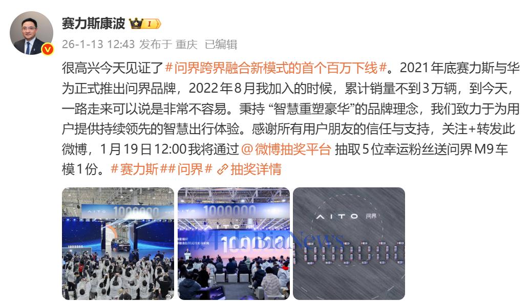 今日,赛力斯集团副总裁康波发文称,“很高兴今天见证了问界跨界融合新模式的首个百万下线。2021年底赛力斯与华为正式推出问界品牌,2022年8月加入的时候,累计销量不到3万辆,到今天,一路走来可以说是非常不容易。”