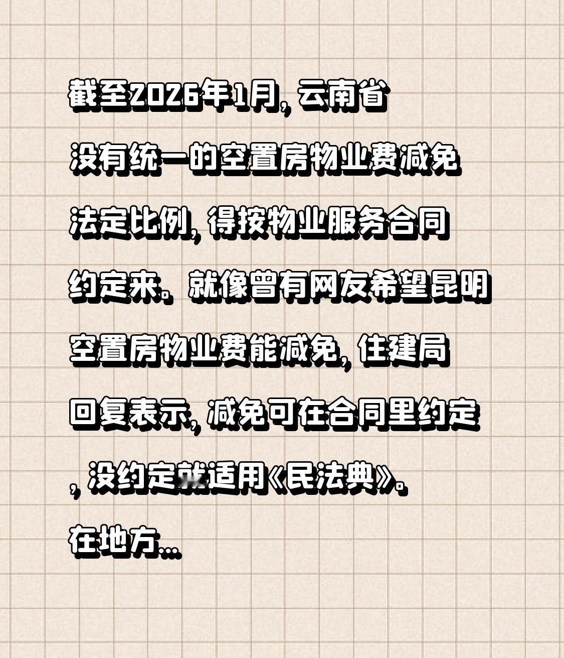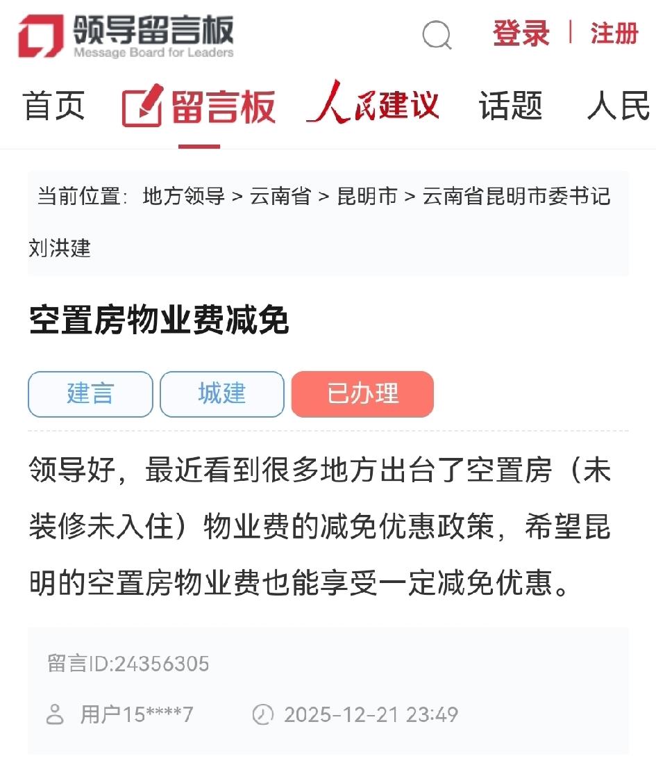 昆明网民在领导留言板给昆明市委书记留言:向空置房物业费减免 领导好,最近看到很多地方出台了空置房(未装修未入住)物业费的减免优惠政策,希望昆明的空置房物业费也能享受一定减免优惠。 截至2026年1月,云南省没有统一的空置房物业费减免法定比例,得按物业服务合同约定来。就像曾有网友希望昆明空置房物业费能减免,住建局回复表示,减免可在合同里约定,没约定就适用《民法典》。 在地方实操上,若房子连续空置6个月及以上,可按70%缴纳物业费,但业主得提供空置证明并提前报备。2026年多地物业新规落地,虽没直接涉及云南空置房减免比例,但整体让物业费更规范。对于云南业主来说,得留意合同约定,也盼后续能有更明确的政策。