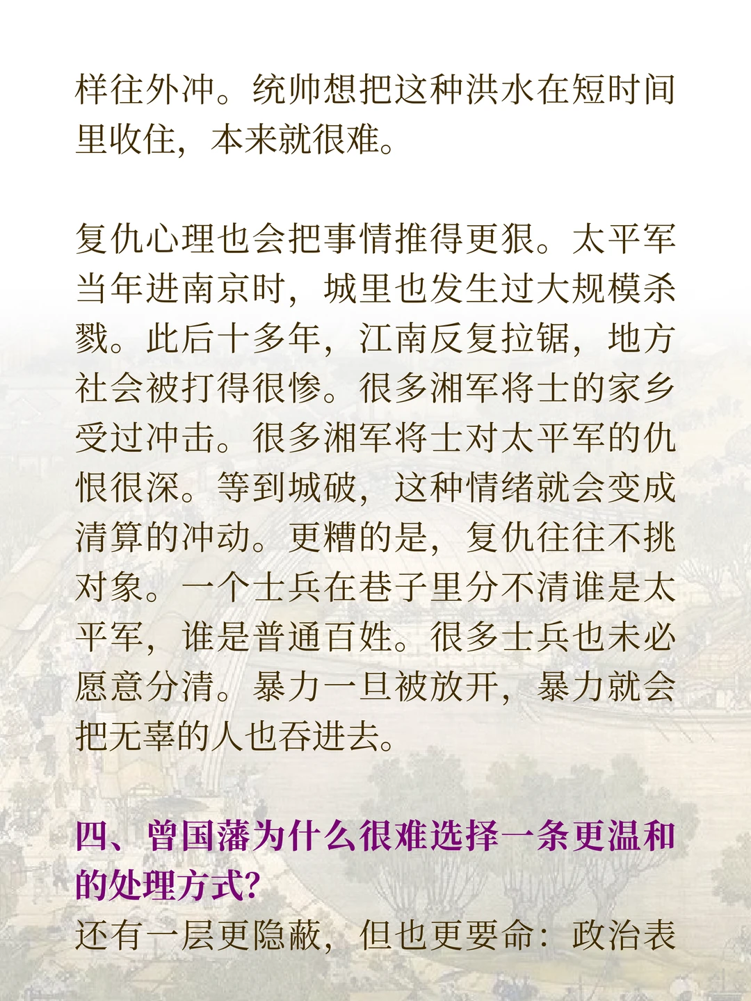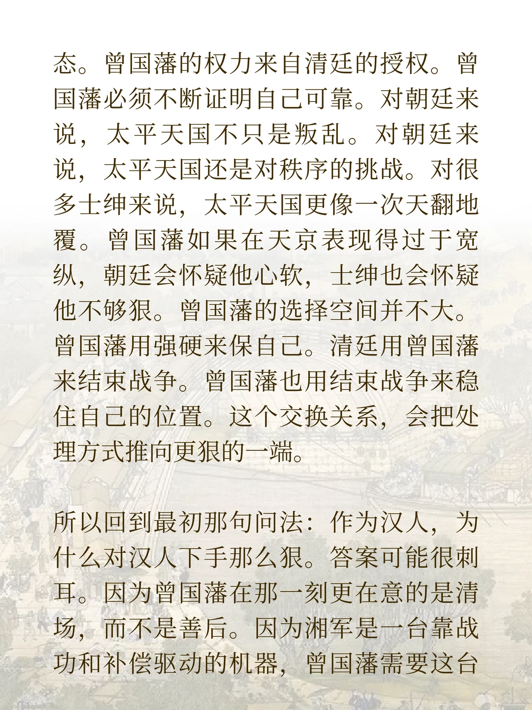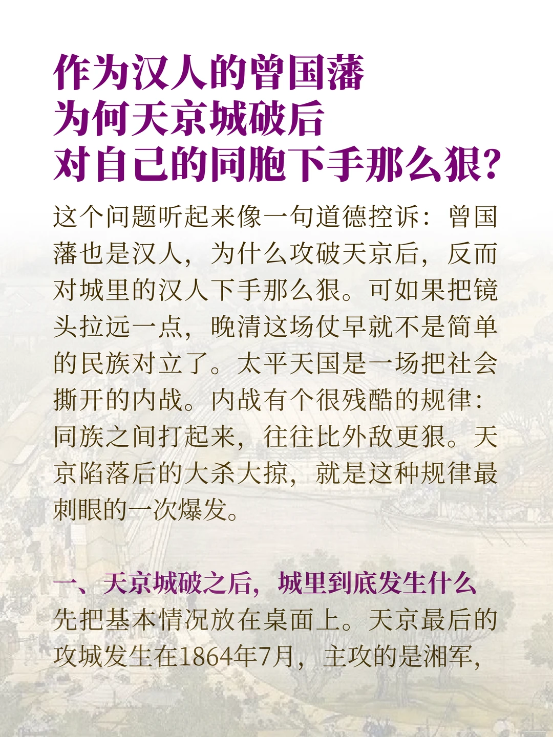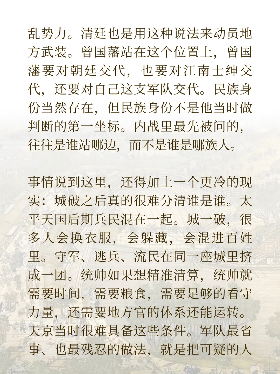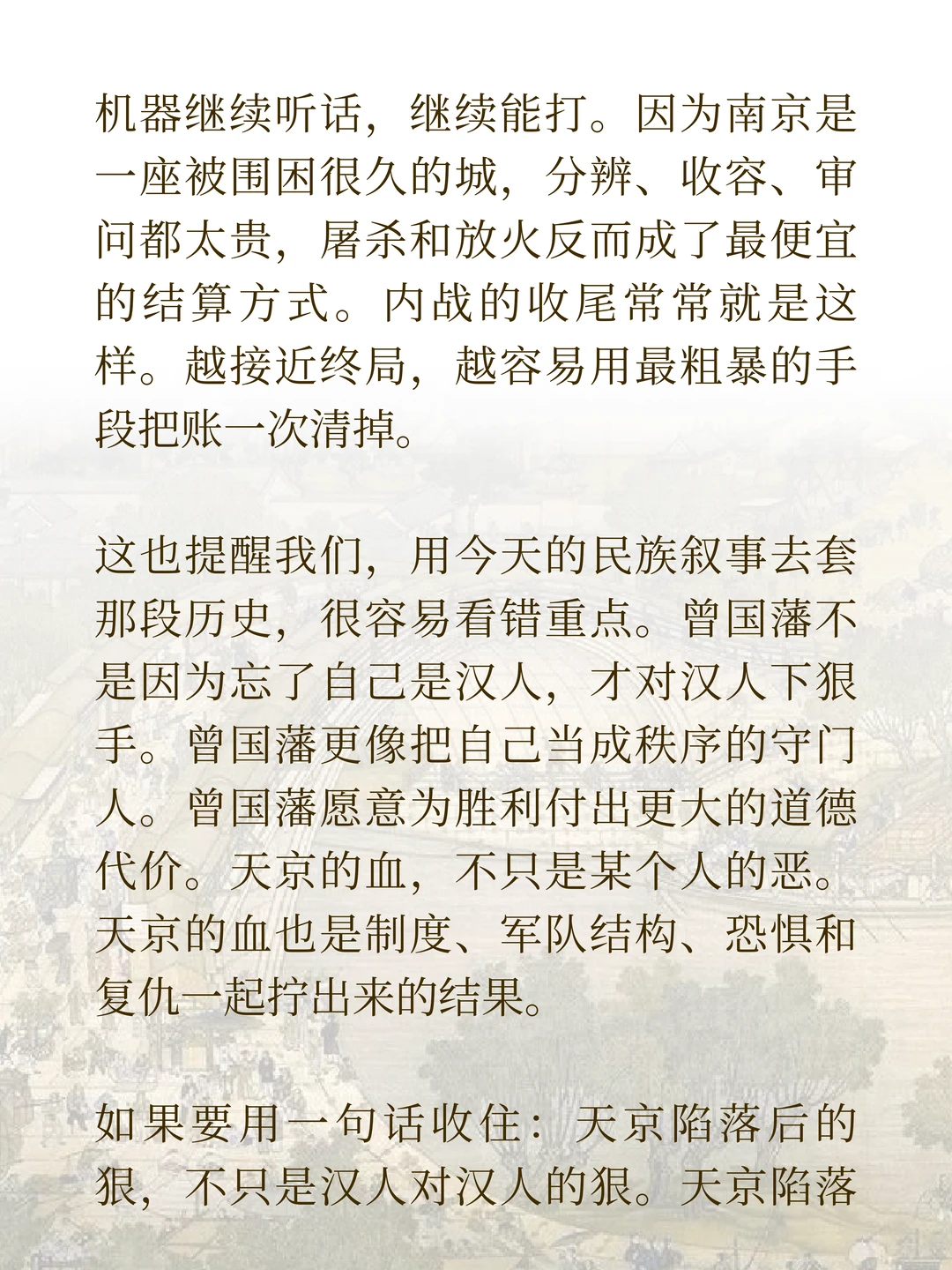 很多人会忍不住问:曾国藩也是汉人,为什么天京一破,城里却死得这么惨? 可真把那段历史摊开来看,会发现这不是“谁对谁狠”的问题,而是内战走到尽头时,所有人一起失控的结果。