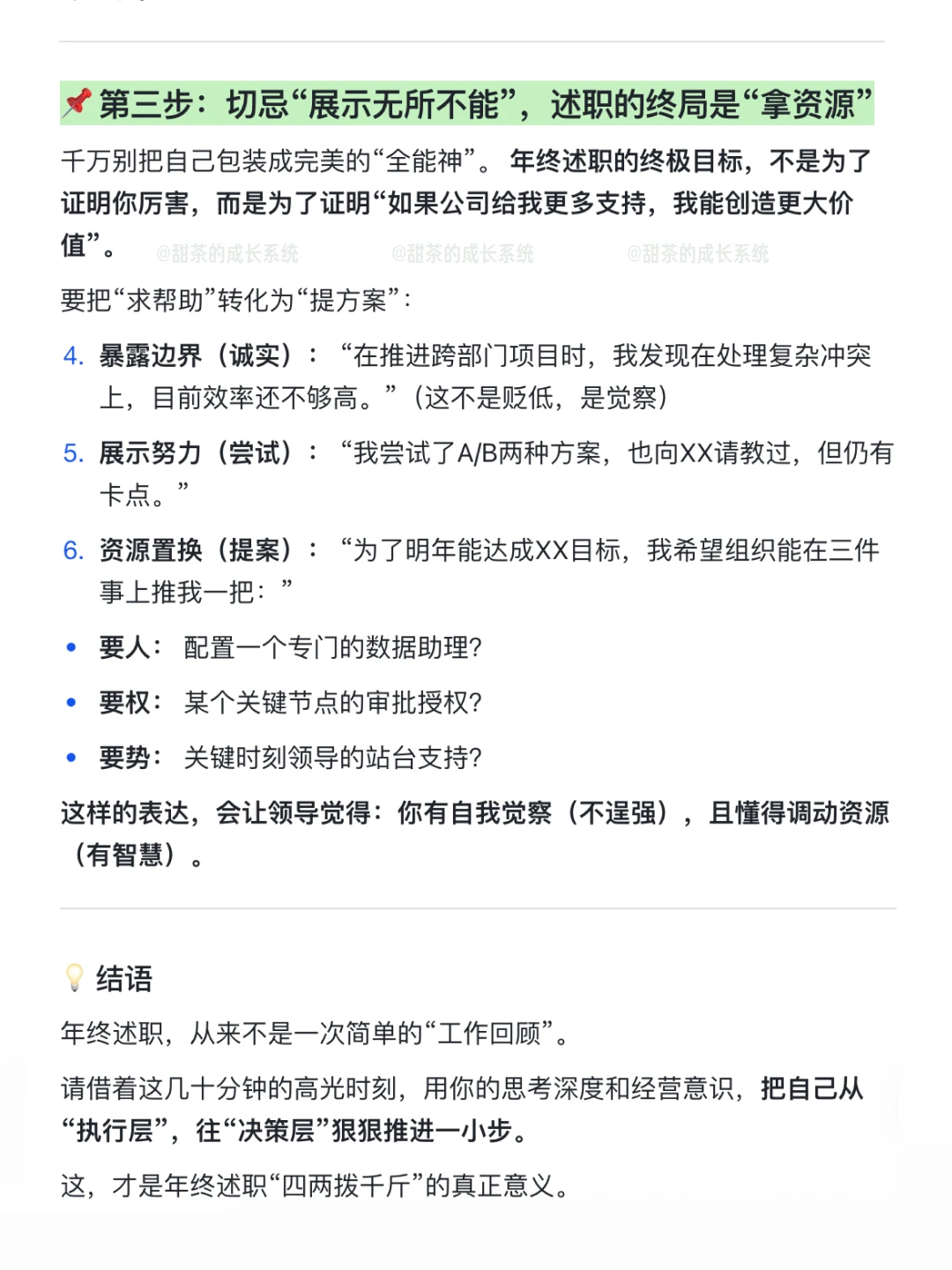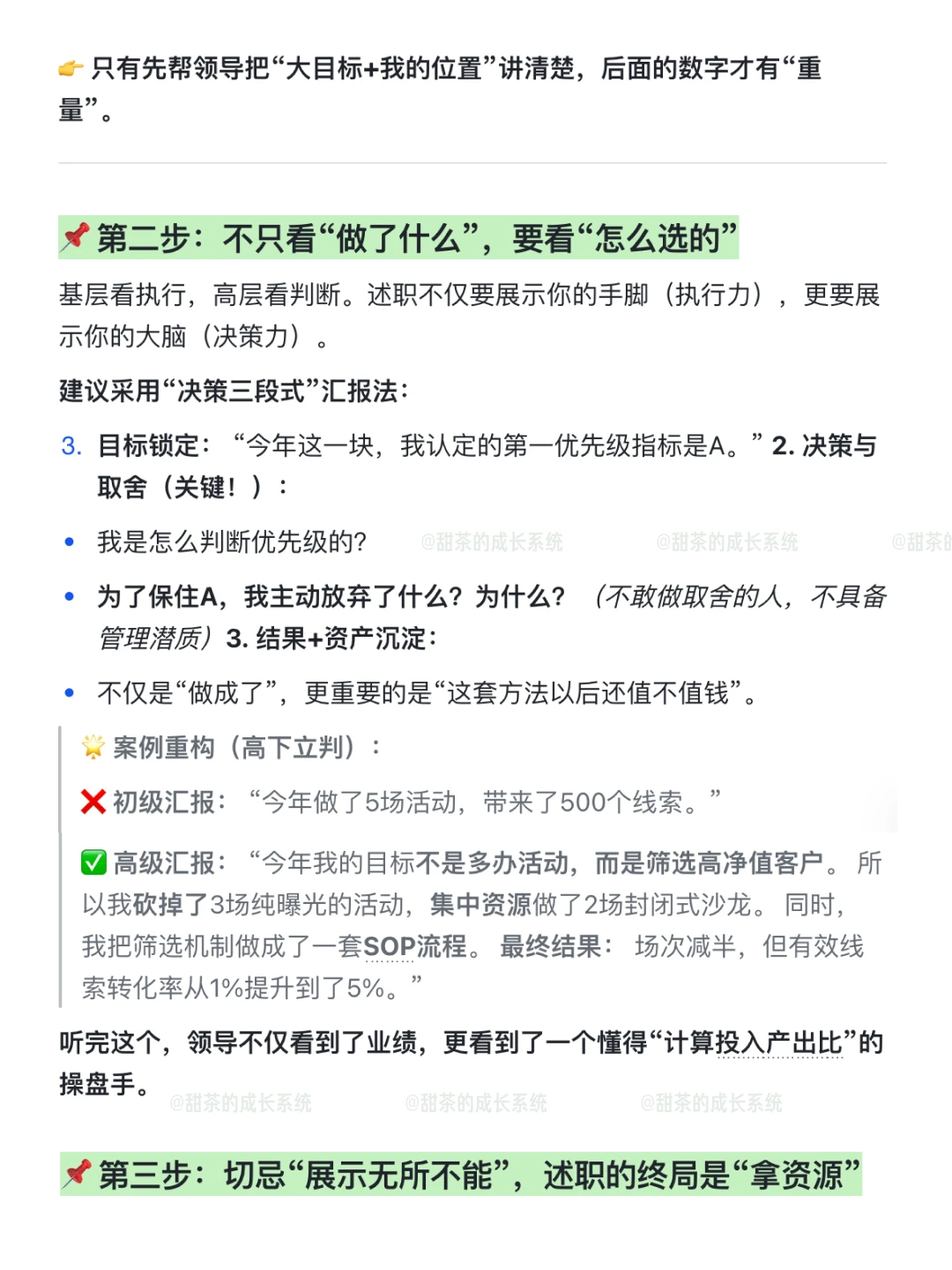 年终述职不是“考试”,而是你申请更高权限的“路演”。 同样几十分钟,有人在报流水账,有人却悄悄完成了身份升级。 区别在于,是否掌握了这 3 个“借力点”👇 1️⃣ 定坐标:先对焦战略,再谈业绩 职级越高的领导,目标感越强。 ❌ 错误(结果先行): 上来就丢数据炸弹,潜台词“老板你看我多苦劳”。 ✅ 进阶(对焦先行): 先把自己嵌入公司大盘。 ▪️ 回顾大盘: 今年核心战役是什么?(保利润/攻市场) ▪️ 界定职责: 我守的这块阵地,为大盘提供了什么价值? 💡 话术: “公司核心是保增长,而我负责的 X 板块,任务是确保续约率不掉队,稳住大后方。” 2️⃣ 秀判断:不只看“做了啥”,更看“砍了啥” 基层拼执行,高层看判断。展示你懂“投入产出比”。 👉 试着采用“决策三段式”汇报: ▪️ 目标锁定: 我认定的第一优先级指标是 A。 ▪️ 决策取舍: 为了保住 A,我主动放弃了什么?(不敢做取舍 = 没管理潜质) ▪️ 资产沉淀: 不仅做成了,还沉淀了一套 SOP。 💡 金句: 场次减半,但转化率翻倍,因为我砍掉了无效的纯曝光活动。 3️⃣ 拿资源:不装“六边形战士”,懂得“借力打力” 述职的核心目的,不是证明你毫无瑕疵,而是证明“给我资源,我能创造更大价值”。 把“求帮助”转化为“提方案”: ▪️ 暴露边界: 诚实说明目前的卡点(这是觉察,不是无能)。 ▪️ 展示努力: 说明尝试过的方案及局限。 ▪️ 资源置换: 为了达成明年目标,我需要三样东西: ① 要人(配置助理) ② 要权(审批授权) ③ 要势(领导站台) 📝 写在最后 别浪费这几十分钟的高光时刻。 用你的思考深度(取舍逻辑)和经营意识(资源调动),把自己从“执行层”,往“决策层”狠狠推进一小步!