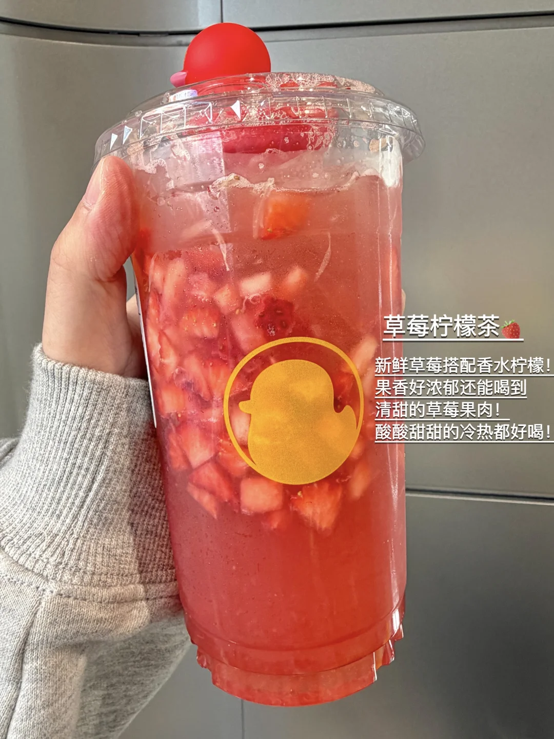 新鲜草莓搭配香水柠檬!果香好浓郁还能喝到清甜的草莓果肉!酸酸甜甜的冷热都好喝!!