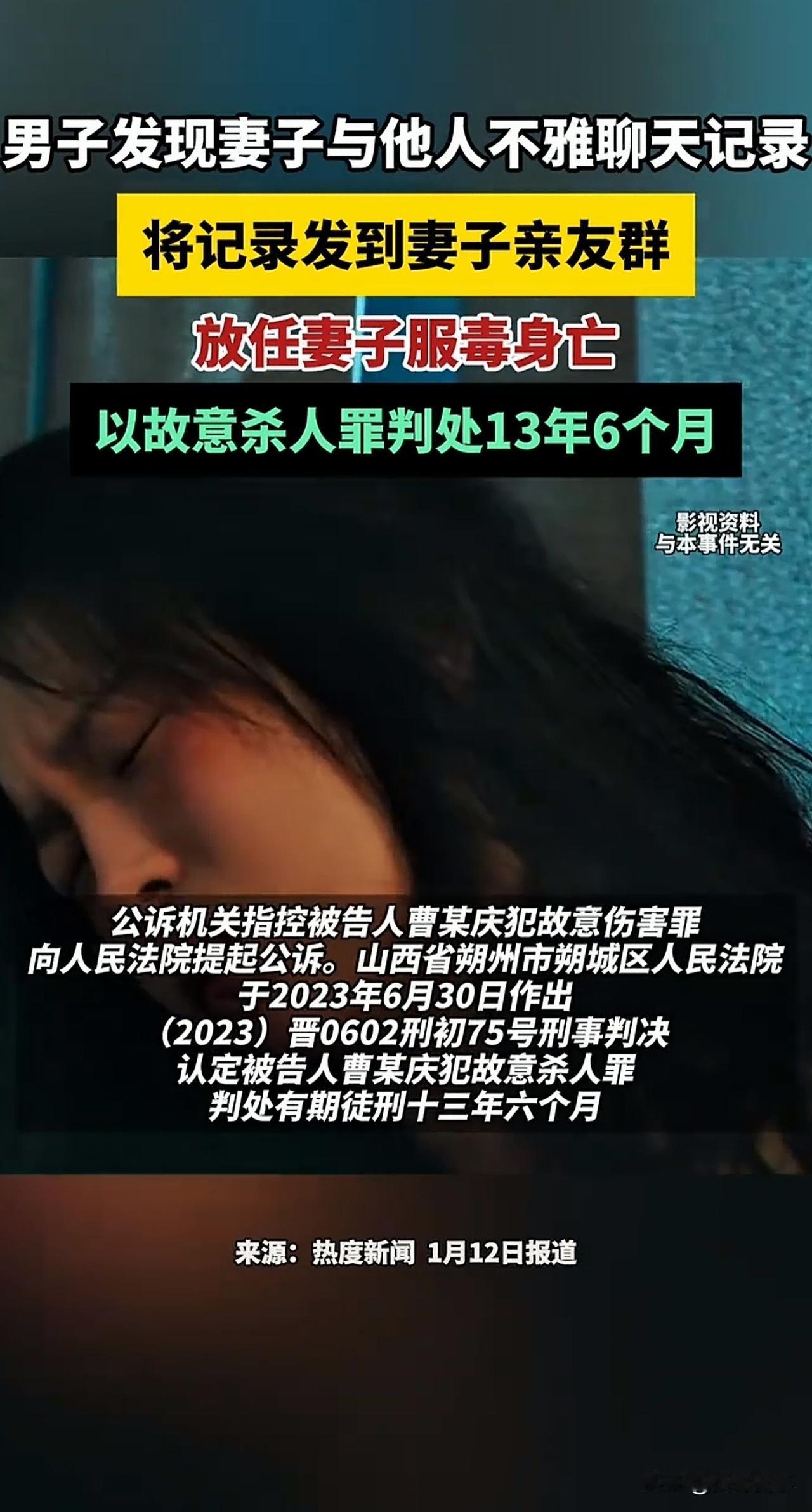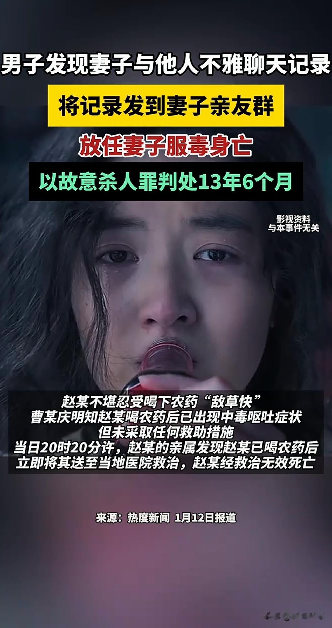 “太狠心了!”山西朔州,一男子查妻子手机,发现里面有妻子和别的男人不雅的聊天记录。男子据此认定妻子出轨,在愤怒下,她辱骂妻子并对其拳脚相加。这还不算完,男子还将此事发在家庭群中,让妻子亲属解决此事。事后,妻子不堪受辱,便选择了服毒自杀,男子见状,则在一旁袖手旁观。最终,妻子身亡,男子也因故意杀人获刑13年6个月,如何评价此案? 据威海资讯1月13日报道,男子曹某和赵某是夫妻关系。 事发当时,曹某偶然拿起妻子赵某的手机查看。 在赵某的微信中,曹某发现妻子竟和一男子聊的火热。 其中,两人一些不雅的聊天记录瞬间点燃了曹某的怒火。 曹某当场辱骂赵某,甚至还动了手。 事后,曹某还不解气,转头就把这些不雅内容发到亲属微信群,还喊话让赵某的母亲和妹妹来“评理”。 曹某的这番操作让赵某彻底破了防。 赵某不堪丈夫的如此羞辱,便拿起家中的农药一饮而尽。 当时,曹某就在一旁,他眼睁睁看着妻子喝下农药,看着她捂着肚子剧烈呕吐、脸色惨白,却始终无动于衷。 直到晚上8点多,赵某的亲属赶到,才慌忙将不省人事的赵某送医治疗。 可农药毒性太烈,且送医太晚,医生拼尽全力,还是没能挽回赵某的生命。 事后,曹某被警方带走。案件移交至检察院,检方以赵某犯故意伤害罪提起公诉。 但法院审理后,却认定他构成故意杀人罪。 在这里,大家可能有疑惑,赵某死亡明明是她自己喝农药所致,为何是曹某犯罪了呢? 这是因为,在法律上,默认夫妻之间有法定的相互救助义务,即夫或妻一方处于危险状态,另一方必须伸出援手,否则,造成严重后果,就是不作为的犯罪。 曹某此前对赵某实施殴打和辱骂,又在家庭群中发布不雅记录,进而导致赵某产生自杀的想法。 曹某作为成年人,完全清楚农药的致命性。 他看见妻子服下农药后,本可以通过打120、送医、催吐等方式挽救妻子。 但曹某却选择了冷眼旁观,其主观上放任妻子中毒死亡的结果发生,客观上不阻止、不施救。 曹某的行为构成不作为的间接故意杀人罪。 而根据《刑法》规定,犯该罪的,处死刑,无期徒刑或十年以上有期徒刑。 最终,法院依法以故意杀人罪判处其有期徒刑13年6个月。 总的来说,不是只有亲手杀人才算犯罪,放任亲人死亡的冷漠,也同样会被予以严惩。 当然,曹某一案也旨在提醒大家,感情里的背叛固然可恨,但解决问题从不是靠暴力和报复。 夫妻有矛盾可以调解,实在过不下去还能走法律程序离婚。 逞一时之快的极端做法,只会错上加错,把自己和对方都拖进深渊。 婚姻不易,就算缘分尽了,也请互相留一份理智与体面。 对此,大家又怎么看呢?欢迎在评论区留言。