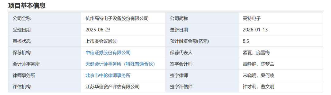 杭州高特电子设备股份有限公司首次公开发行股票并在创业板上市申请通过审议,现已进入提交注册阶段。由中信证券股份有限公司担任保荐机构。