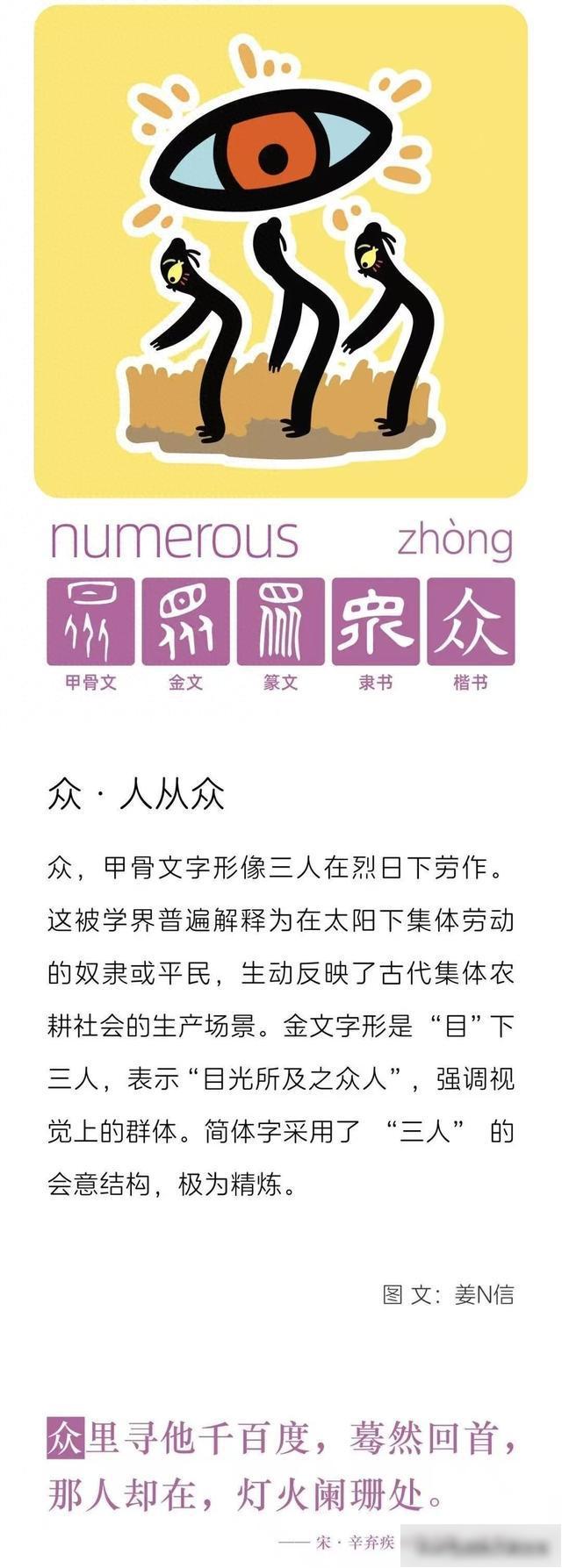 众,甲骨文字形像三人在烈日下劳作。这被学界普遍解释为在太阳下集体劳动的奴隶或平民,生动反映了古代集体农耕社会的生产场景。金文字形是“目”下三人,表示“目光所及之众人”,强调视觉上的群体。简体字采用了“三人”的会意结构,极为精炼。