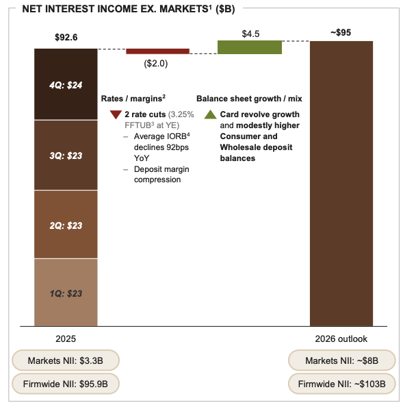 2026年展望方面,在2026年美联储降息两次的预设中,摩根大通预期全年净利息收入将从去年的959亿美元上升到1030亿美元。主要增长点来源于信用卡循环余额增长和存款规模稳中有升。不过费用支出也将从953亿美元上升至1050亿美元。