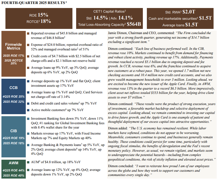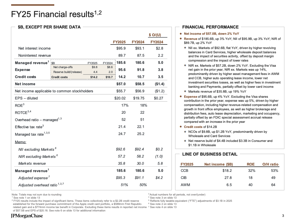 整体而言,摩根大通2025年总共取得1856亿美元营收,同比上升3%,净利润570亿美元,较2024年下降14亿美元,仍相当于每天净赚1.56亿美元。