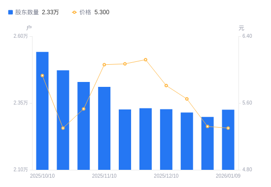 日期A股户数(户)流通A股户均持股数(股)户均持股市值(万元)2026-01-092325111256.035.972025-12-312298011388.776.062025-12-192314711306.616.392025-12-102327211245.886.532025-11-282330811228.516.872025-11-202326311250.236.832025-11-102410710856.356.582025-10-312429210773.675.962025-10-202472710584.145.612025-10-102541510297.626.11