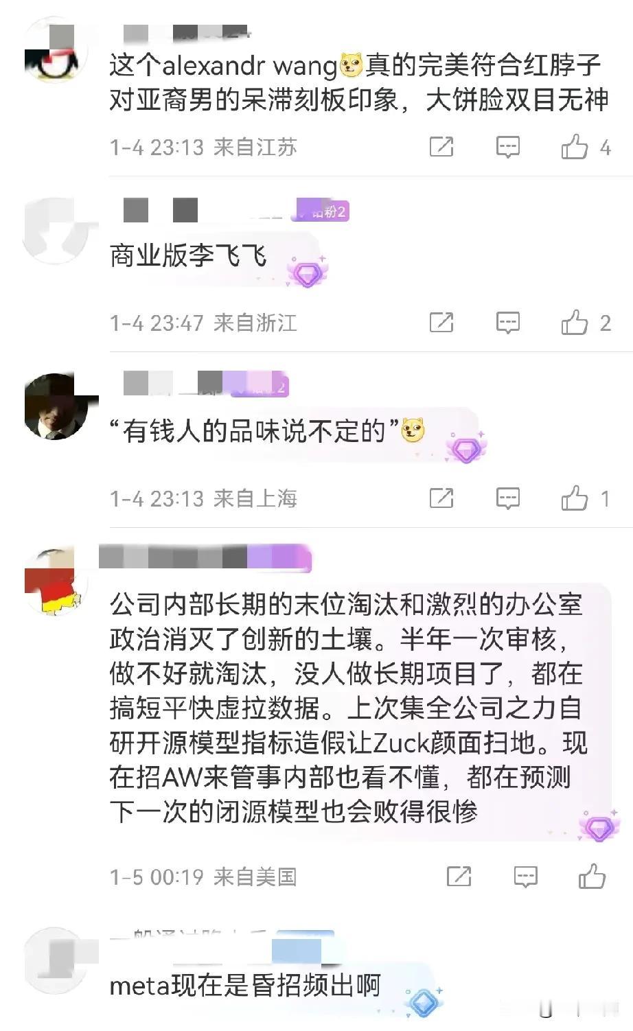 这个所谓的美国华裔AI天才被美国人炮轰缺乏经验,不完全了解人工智能研究人员!这个姓王的华裔,之前疯狂诋毁中国的AI大模型,甚至呼吁美国加强制裁,子确保美国在AI上的优势,它的父母都是从中国过去的移民,也在为美国科研效力,然后它年纪轻轻就搞了一个AI公司,其实就是一个数据外包公司,非常高调,扎克伯格把它收入麾下,据说年薪上亿美元,只能说扎克伯格这几年昏招频出,去年花巨资到处挖人,现在一个个离职,然后还爆出这么多的黑料,扎克伯格也被这个所谓的华裔AI天才坑惨了,本来就是一个搭上风口赚了点钱的浮夸年轻人,你把它放在那么重要的位置,能不被坑惨吗?