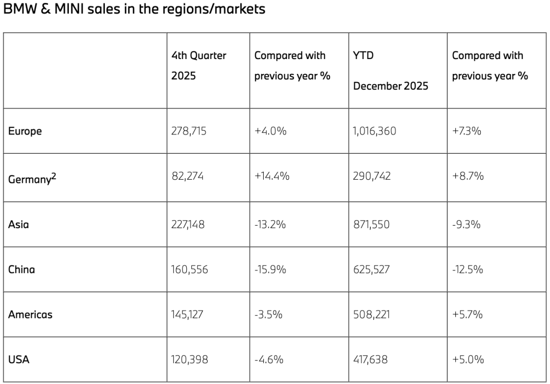 梅赛德斯-奔驰的处境并非是其单独遇到的问题,在一定程度上反映了整个传统豪华汽车品牌面临的共同挑战。除了梅赛德斯-奔驰外,宝马集团等车企销量出现了下滑。数据显示,宝马集团2025年全球销量为2,463,715辆,同比增长0.5%,其中中国市场销量625,527辆,同比下滑12.5%,占亚洲市场总销量72%,占全球总销量25%,仍然是宝马集团全球最大单一市场。