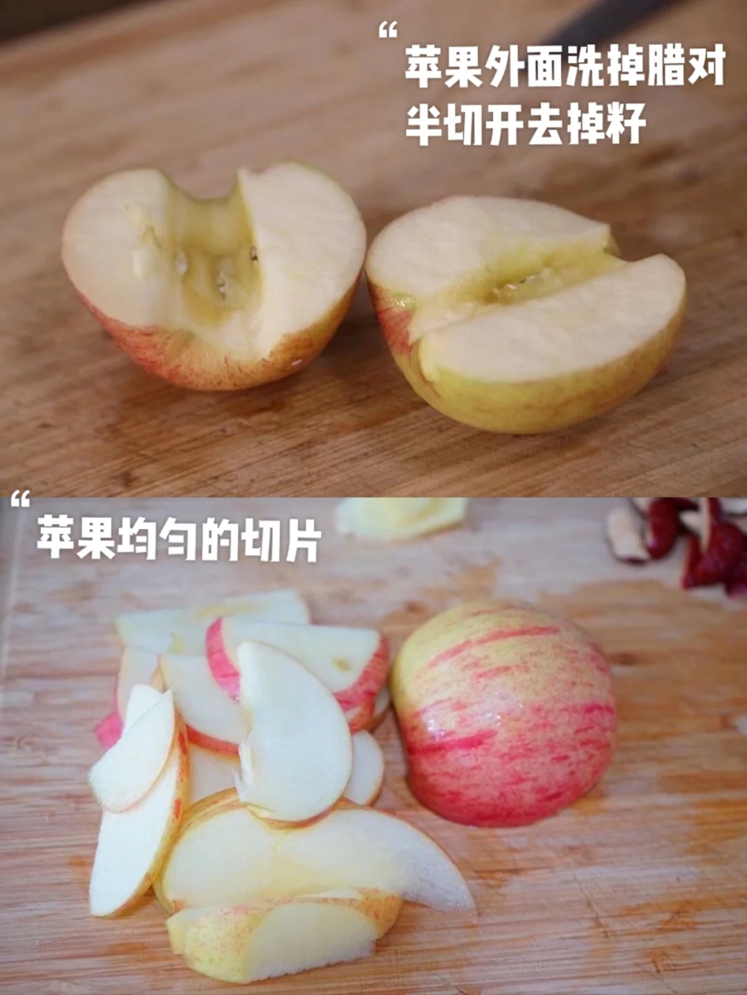 1.苹果外面用盐清洗掉蜡,然后对半切开,去掉中间的籽