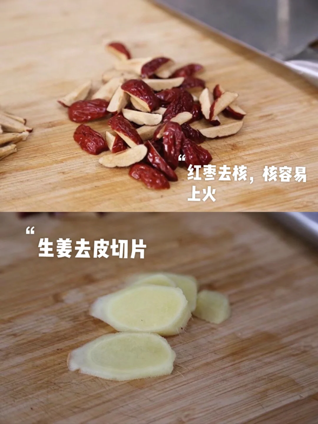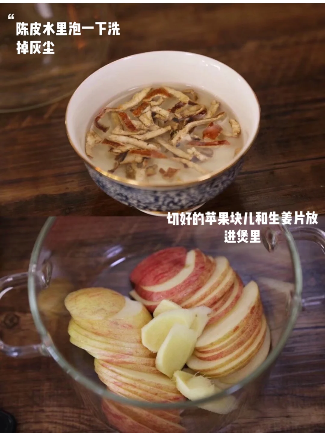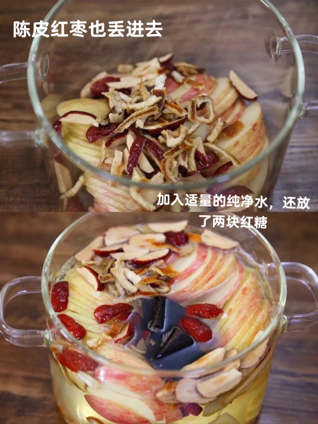6.苹果生姜丢进煲里7.红枣和陈皮也丢进去