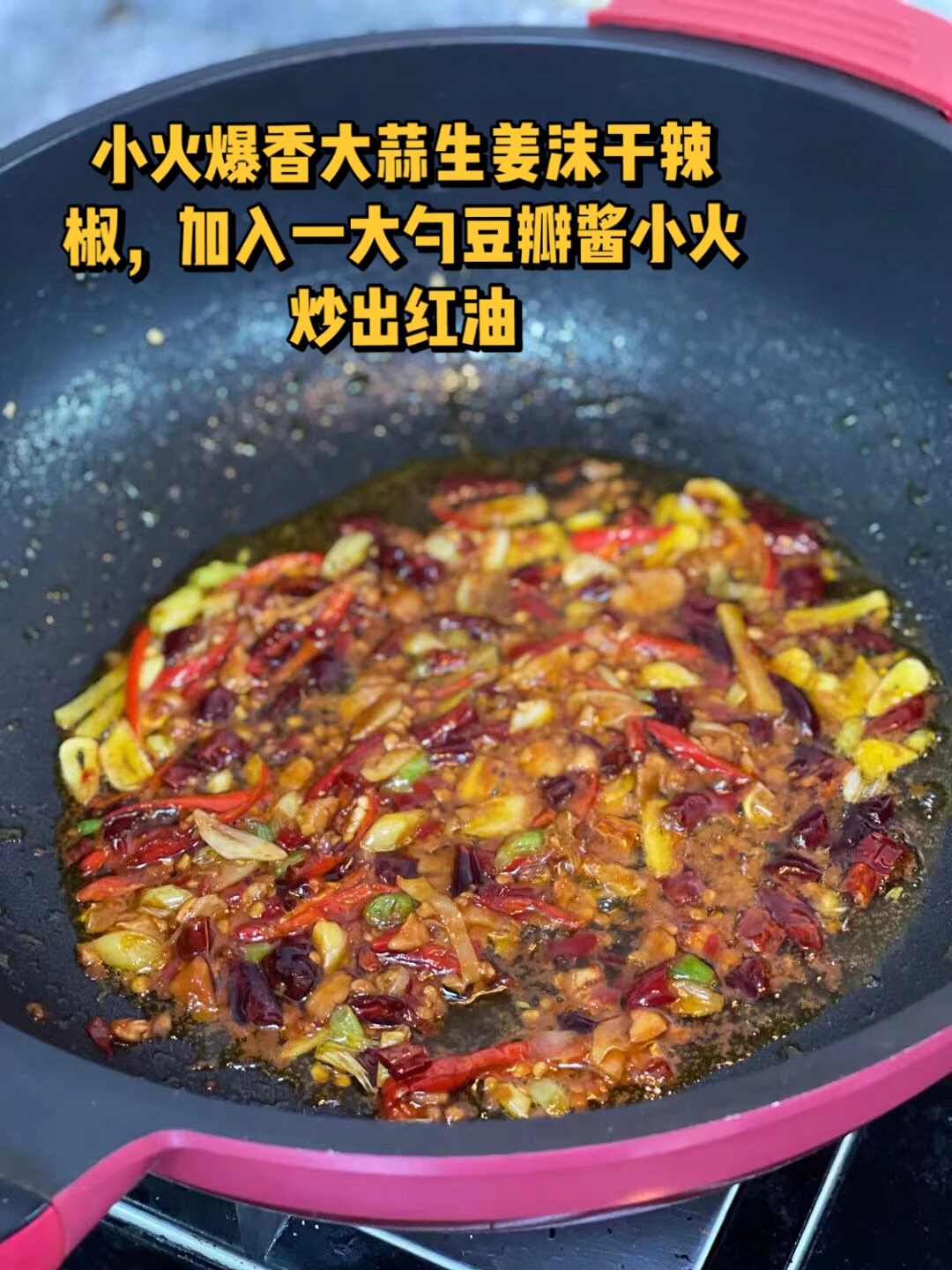 5.锅另外放少许油,大蒜生姜葱白段干辣椒小火爆香,丢入一大勺豆瓣酱小火炒出红油