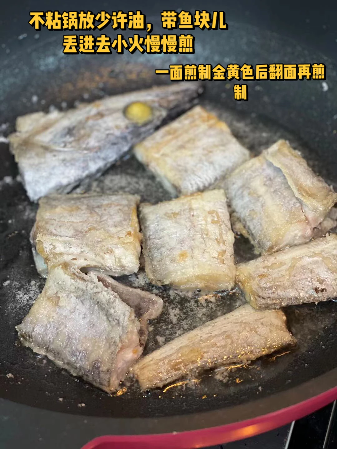4.平底锅里放少许油,带鱼块儿放进去小火煎,一面煎制金黄色以后翻面煎制,捞起来待用