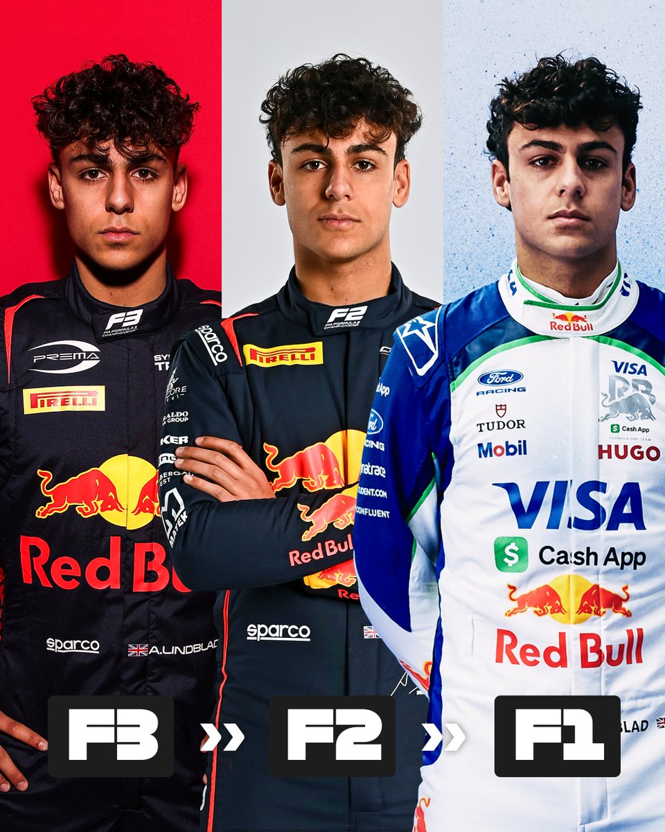 F1官方推特账号报道。F3➡F2➡F1ArvidLindblad在红牛体系内用三年时间从F3晋级到F2再到F1的旅程确实令人印象深刻#F1