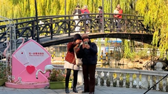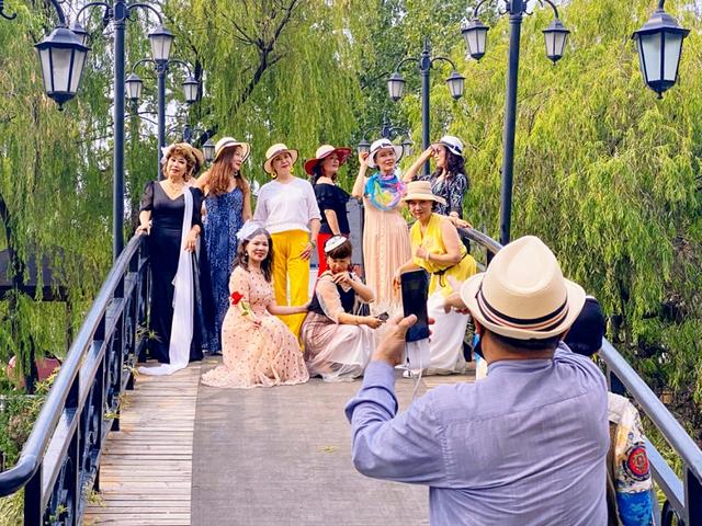 园内处处可见“潮酷”银发族的身影。这些阿姨打扮时尚,拖着一个装满“战袍”的行李箱,移步换景之间,不断变换角度、更换造型,她们身边要么是年龄相仿的老姐妹,要么是背着相机的老爷叔,几人一组、十几人一组、尽情拍摄。