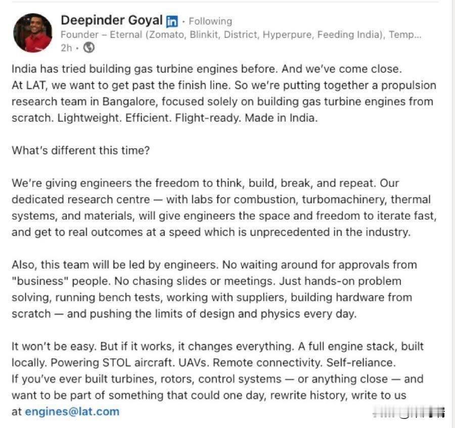 Deepinder Goyal(迪平德·戈亚尔)是 Zomato、Blinkit 和 LAT Aerospace 的创始人。他通过 LAT Aerospace 启动了一项旨在构建印度本土燃气轮机发动机的大胆新计划。 项目详情 公司: LAT Aerospace(光子先进技术)。 目标: 设计、开发和制造轻型、高效且适合飞行的本土燃气轮机发动机。 应用: 这些发动机旨在为空中短距起降(STOL)飞机、无人机(UAV)和偏远地区的连接平台提供动力。 愿景: 通过利用未充分利用的简易机场,实现区域航空旅行的革命,目标是使航空旅行像乘坐公共汽车一样方便。 团队: 该计划由工程师主导,在班加罗尔建立了一个专门的推进研究团队。 LAT Aerospace 是一项独立于 Eternal(Zomato 母公司)的倡议,Goyal 已个人投资 2000 万美元,并担任非执行联合创始人。