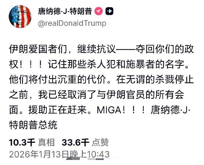 特朗普亲自鼓动伊朗抗议者夺权! 美国总统特朗普发文表示,已取消与伊朗官员的所有会面,援助正在赶来。他要求伊朗的“爱国者们”持续抗议,夺回政权。 伊朗有如今这般局面,也是自身左右摇摆所致,着实不值得同情。而特朗普实在太坏,越是这种时候越下狠手。此前他还佯装与伊朗谈判,如今却突然不谈了,可见谈判不过是缓兵之计。 眼见伊朗服软,美国的兴致便来了!事实无数次证明,你越是妥协,美国就越得寸进尺。可在某些国家看来,还觉得能与美国能谈出情谊来,这不是把自己往火坑里推嘛! 推翻伊朗政权是美以既定政策,美以要的是一统中东!所以,伊朗挨揍是横竖躲不过!