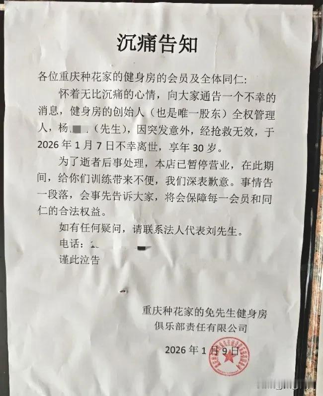 健身房老板自称意外身亡,大量市民称刚办会员不久,怀疑其卷款跑路,目前无法联系到负责人。事发1月11日,多名重庆市民向记者反应,自己在2025年11月左右,在重庆市“种花家的兔先生”健身房办了会员卡,缴费数千元到数百元不等,1月9日就发现健身房关门,门口张贴一张“老板身亡”的告示。 ​记者发现,这家健身房创办于2024年,在这则《沉痛告知》中称健身房的老板也是唯一负责人的杨某,因突发意外抢救无效,于2026年1月7日不幸身亡,因为需要处理后事,健身房暂停营业,后面还留下了法人代表的电话号码。 但是该号码无法接通,多名会员称直到13日也没有找到所谓的法人代表刘先生,无法退款。当地相关部门获悉后,立即成立调查组对相关事件进行了调查,目前还在确认杨某是否因身亡而关闭该店。 有关法律人士表示,健身房这类门店,十分容易出现卷款跑路的情况“房子租的、器械租的、员工临时的,大量拉人开会员,骗取数百万会员费后就跑路”。正常的门店老板身亡会有亲属继承继续营业,处理后事也无需闭店。 重庆一健身房老板自称身亡疑似跑路 多市民称刚办会员卡健身房就关门