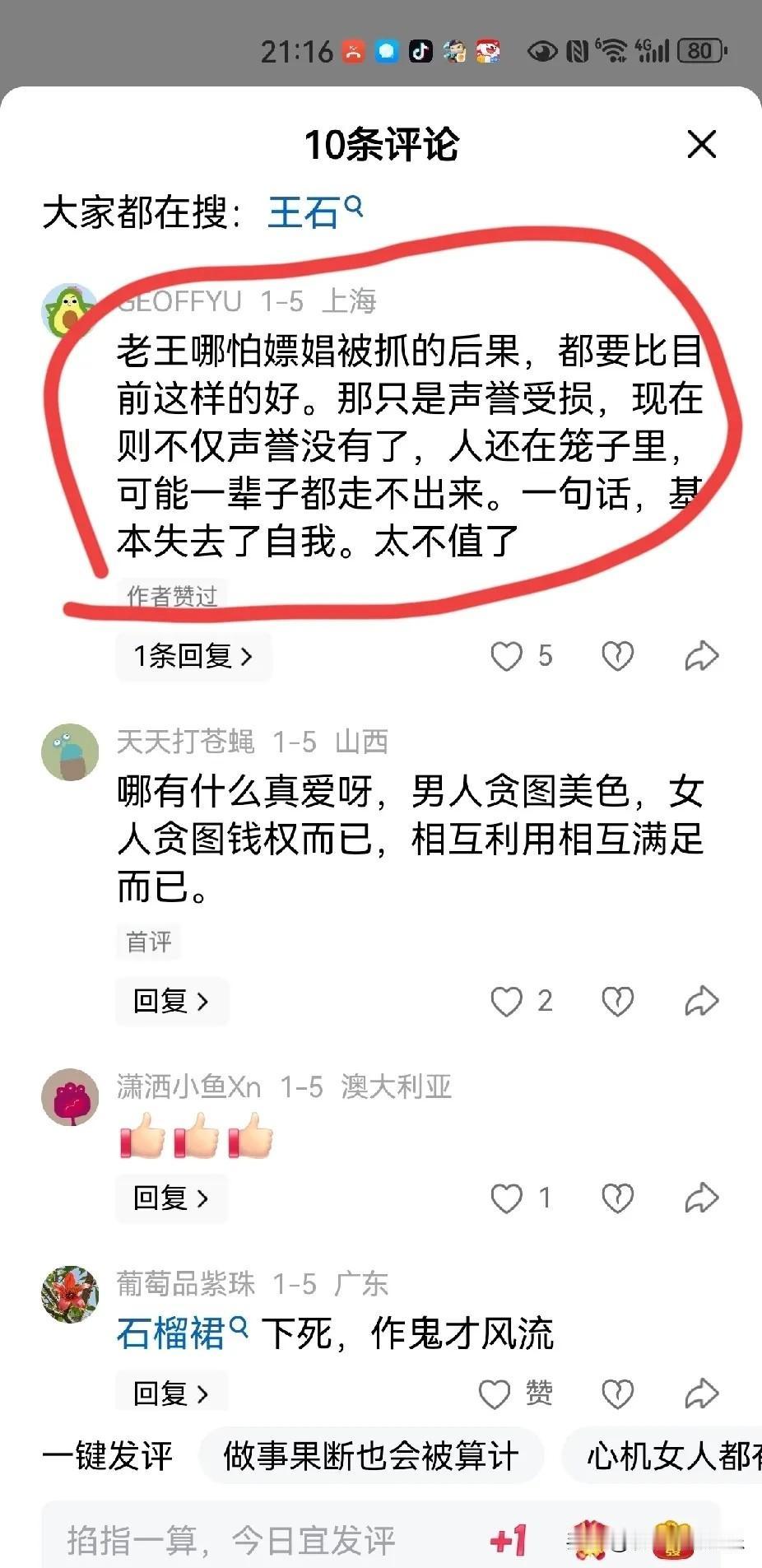网友太有才了,他说王石哪怕嫖娼的下场都比现在好,顶多失去了名誉晚节不保,至少还是自由身,现在人财两空还要在牢笼里度过晚年。 人生能有几个十几年,王石已经没有试错成本,他像一头困兽一样,娶错妻毁三代的含金量还在上升。 和错的人一起,无论怎么经营都没有用,好的婚姻不是经营出来的,而是对的时间遇见对的人,双向奔赴才有用。