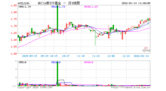 1月14日,截止午间收盘,MSCIA股ETF基金(512180)涨0.80%,报1.755元,成交额19.54万元。MSCIA股ETF基金(512180)重仓股方面,贵州茅台截止午盘涨0.43%,宁德时代跌0.22%,工业富联涨1.55%,招商银行跌0.15%,长江电力涨0.26%,紫金矿业涨2.07%,中国平安涨0.12%,比亚迪涨0.22%,寒武纪涨1.56%,海光信息涨5.96%。