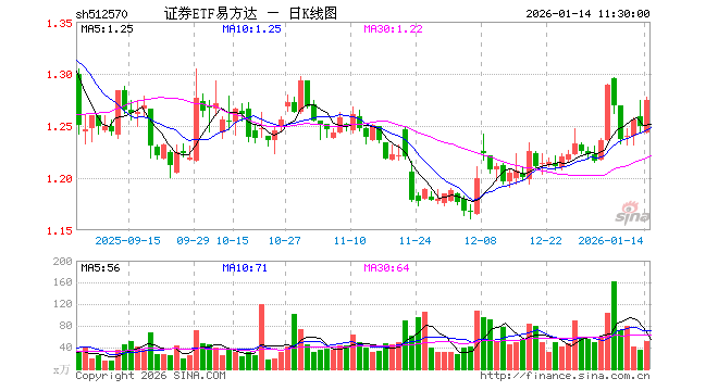 1月14日,截止午间收盘,证券ETF易方达(512570)涨2.08%,报1.275元,成交额6588.10万元。证券ETF易方达(512570)重仓股方面,东方财富截止午盘涨4.82%,中信证券涨1.68%,国泰海通涨1.23%,华泰证券涨1.45%,广发证券涨1.44%,招商证券涨1.85%,东方证券涨1.45%,申万宏源涨1.30%,兴业证券涨1.39%,中金公司涨1.51%。