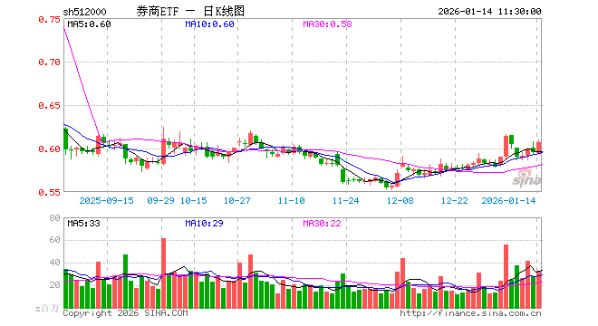 1月14日,截止午间收盘,券商ETF(512000)涨2.02%,报0.607元,成交额19.93亿元。券商ETF(512000)重仓股方面,东方财富截止午盘涨4.82%,中信证券涨1.68%,国泰海通涨1.23%,华泰证券涨1.45%,广发证券涨1.44%,招商证券涨1.85%,东方证券涨1.45%,申万宏源涨1.30%,兴业证券涨1.39%,中金公司涨1.51%。
