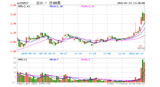1月14日,截止午间收盘,云计算ETF广发(159527)涨6.78%,报2.616元,成交额5290.45万元。云计算ETF广发(159527)重仓股方面,中际旭创截止午盘跌1.04%,新易盛跌0.39%,科大讯飞涨5.03%,中科曙光涨3.45%,浪潮信息涨3.98%,金山办公涨2.48%,紫光股份涨3.94%,恒生电子涨10.00%,润和软件涨6.49%,拓维信息涨4.25%。