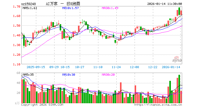 1月14日,截止午间收盘,人工智能ETF基金(159248)涨2.73%,报1.653元,成交额3934.05万元。人工智能ETF基金(159248)重仓股方面,新易盛截止午盘跌0.39%,中际旭创跌1.04%,寒武纪涨1.56%,澜起科技涨3.38%,中科曙光涨3.45%,科大讯飞涨5.03%,豪威集团涨1.11%,海康威视涨3.40%,浪潮信息涨3.98%,金山办公涨2.48%。