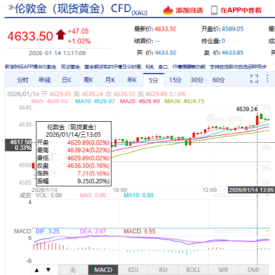 北京时间1月14日下午,现货黄金日内涨超50美元,涨至4639.11美元/盎司的历史新高,涨幅1.12%。