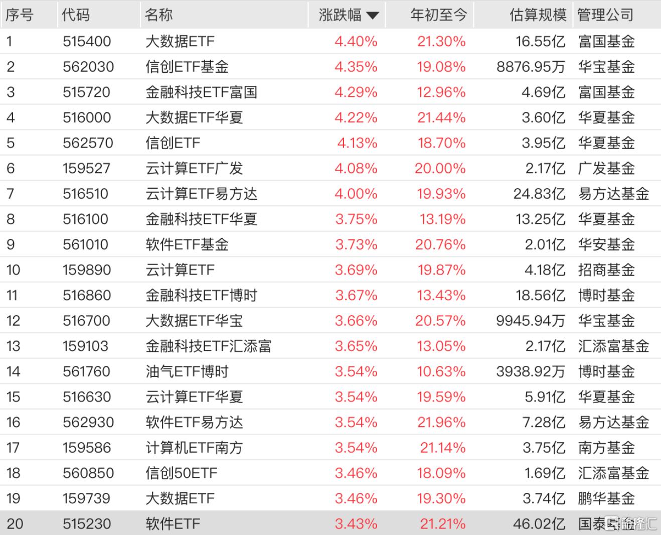 截至发稿,大数据ETF、信创ETF基金、金融科技ETF富国、大数据ETF华夏、信创ETF、云计算ETF广发、云计算ETF易方达涨超4%。