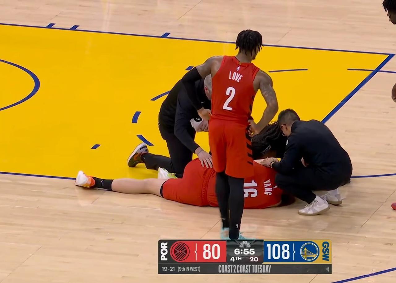 全场鼓掌!杨瀚森积极拼抢导致头部受伤! 杨瀚森虽然没能为开拓者做出太大贡献,但是作为大中锋的他愿意倒地积极拼抢的行为却获得了勇士主场球迷的尊重,当杨瀚森头部受伤之后,勇士主场球迷为他送上了掌声鼓励,这是对杨瀚森积极拼抢的认可。 杨瀚森的后脑勺撞到了勇士球员的膝盖上,杨瀚森随后回到更衣室接受检查治疗,希望杨瀚森没有遭遇脑震荡,否则他将因此缺阵一段时间!
