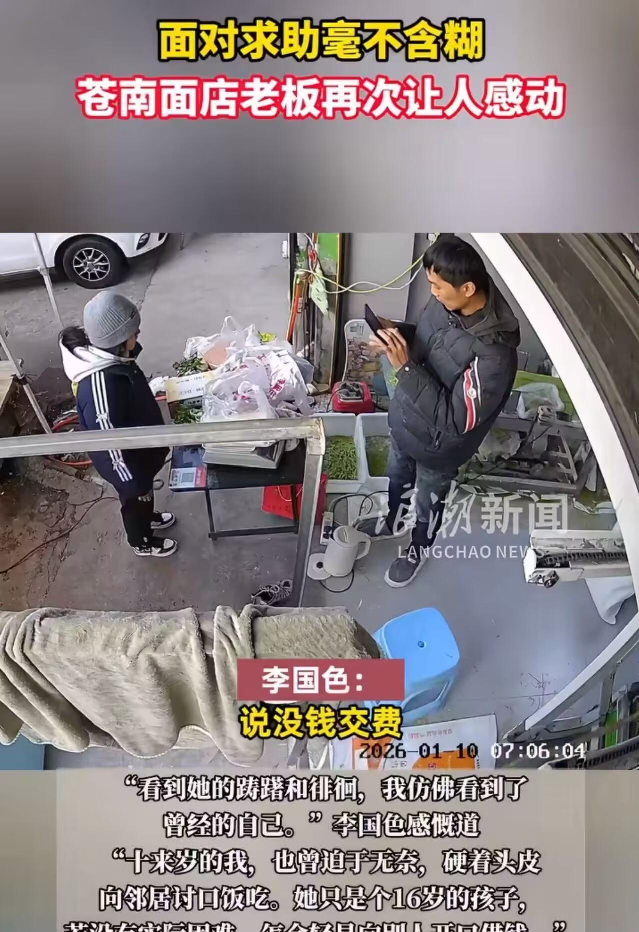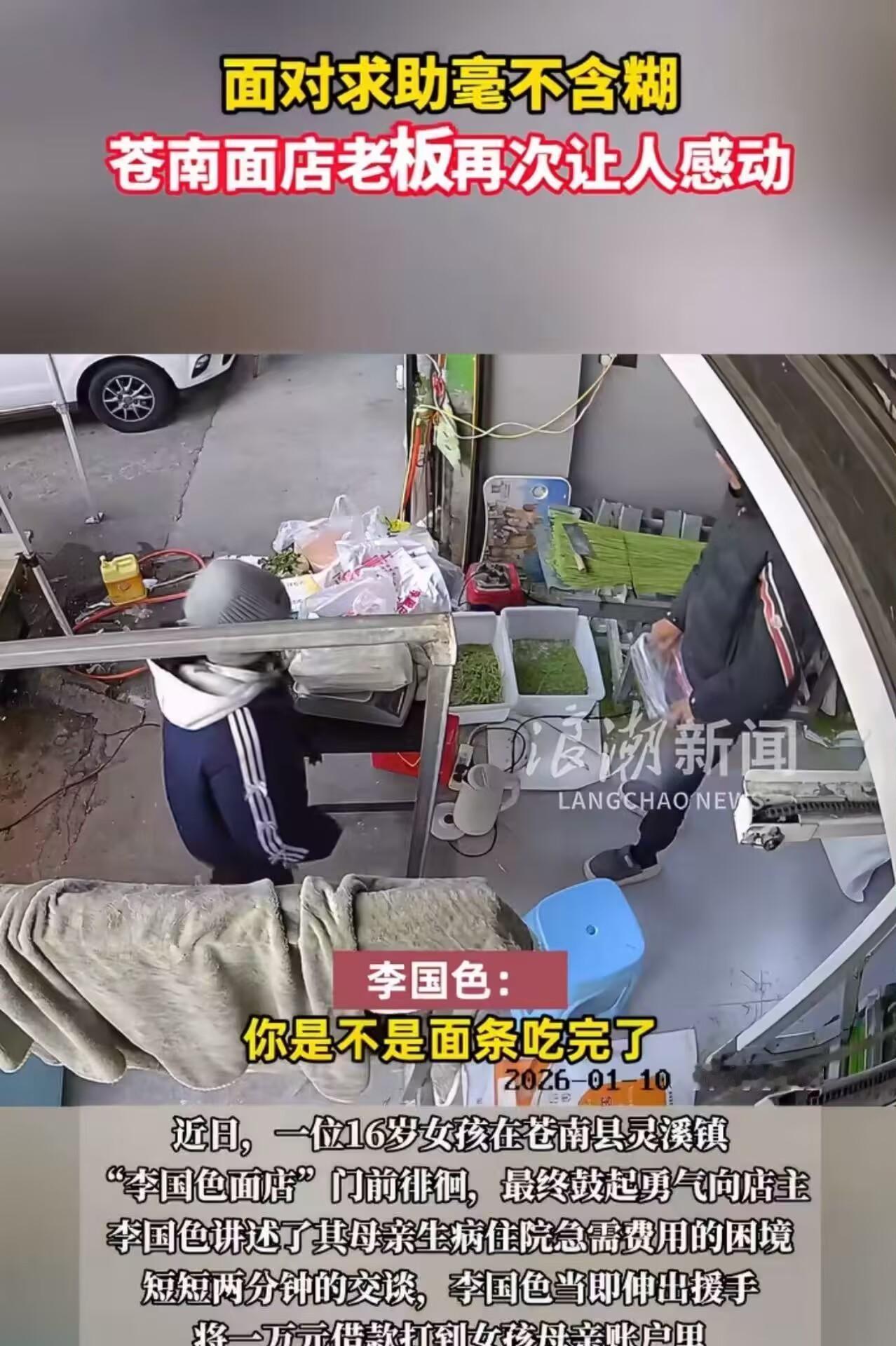 温州苍南这家面馆老板真是大义啊,又干了一件大事,给女孩转账一万,这钱他真给啊! 1月10号早上,一个17岁的高中生跑到李国色的面店,低声问他能不能借一万块。她妈住院了,差押金,再不交钱就得出院。 李国色其实早就认识这母女。两年前知道女孩可能辍学,他就开始资助了,每学期给钱送面。这次听完情况,他直接要了女孩妈妈的微信,视频一看,人确实在病床上,立马转了一万过去。 这老板不是第一次干这种事了。以前有个老人拿手绘“假币”买面,他收了九年,直到老人去世。大家笑他傻,他说,那是人家的尊严,我不能撕破。 现在他帮的人越来越多,善款经手超160万,还带着人直播助农。他自己说,一年卖面赚不了多少,但能帮一点是一点。 那天女孩接过转账信息,眼泪掉下来都没擦,说了句谢谢就往医院跑。李国色只回了一句:先顾好你妈。 你们会为这样有大爱的老板点赞吗?