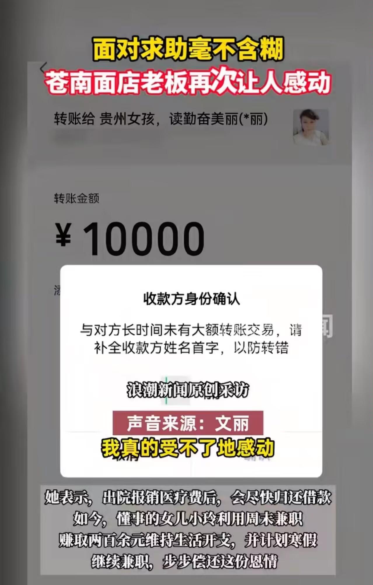 温州苍南这家面馆老板真是大义啊,又干了一件大事,给女孩转账一万,这钱他真给啊!