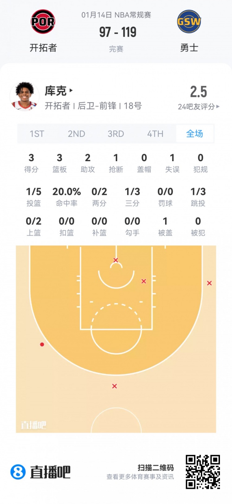 开拓者落选秀贾旺特·库克登场13.5分钟