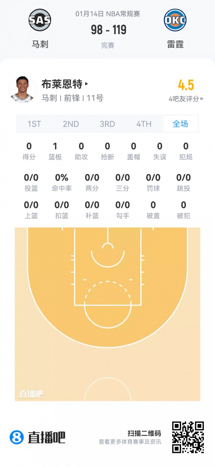 马刺首轮14号秀卡特·布莱恩特登场1.7分钟