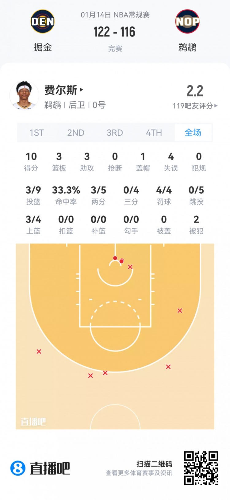 鹈鹕首轮7号秀费尔斯登场26.1分钟