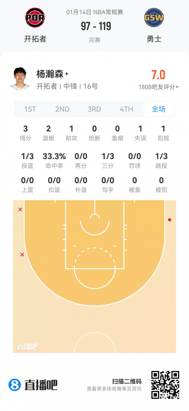 开拓者首轮16号秀杨瀚森登场12.6分钟