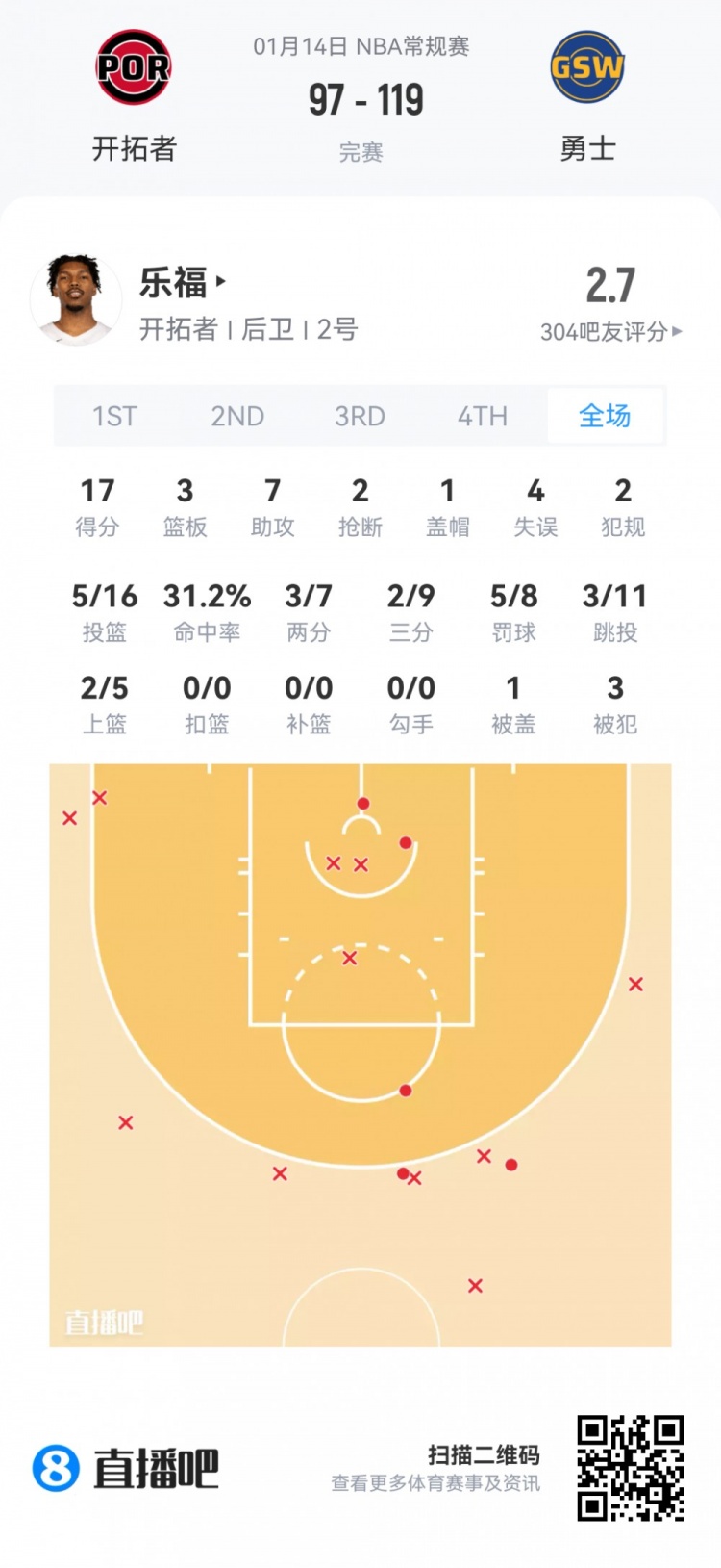开拓者落选秀凯莱布·乐福登场33.9分钟