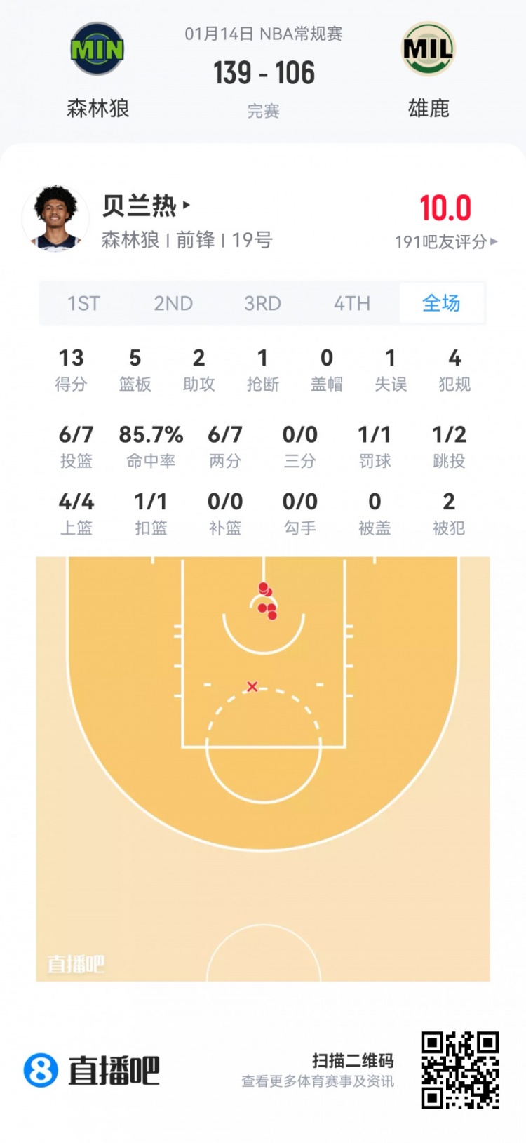 森林狼首轮17号秀贝兰热登场29.7分钟
